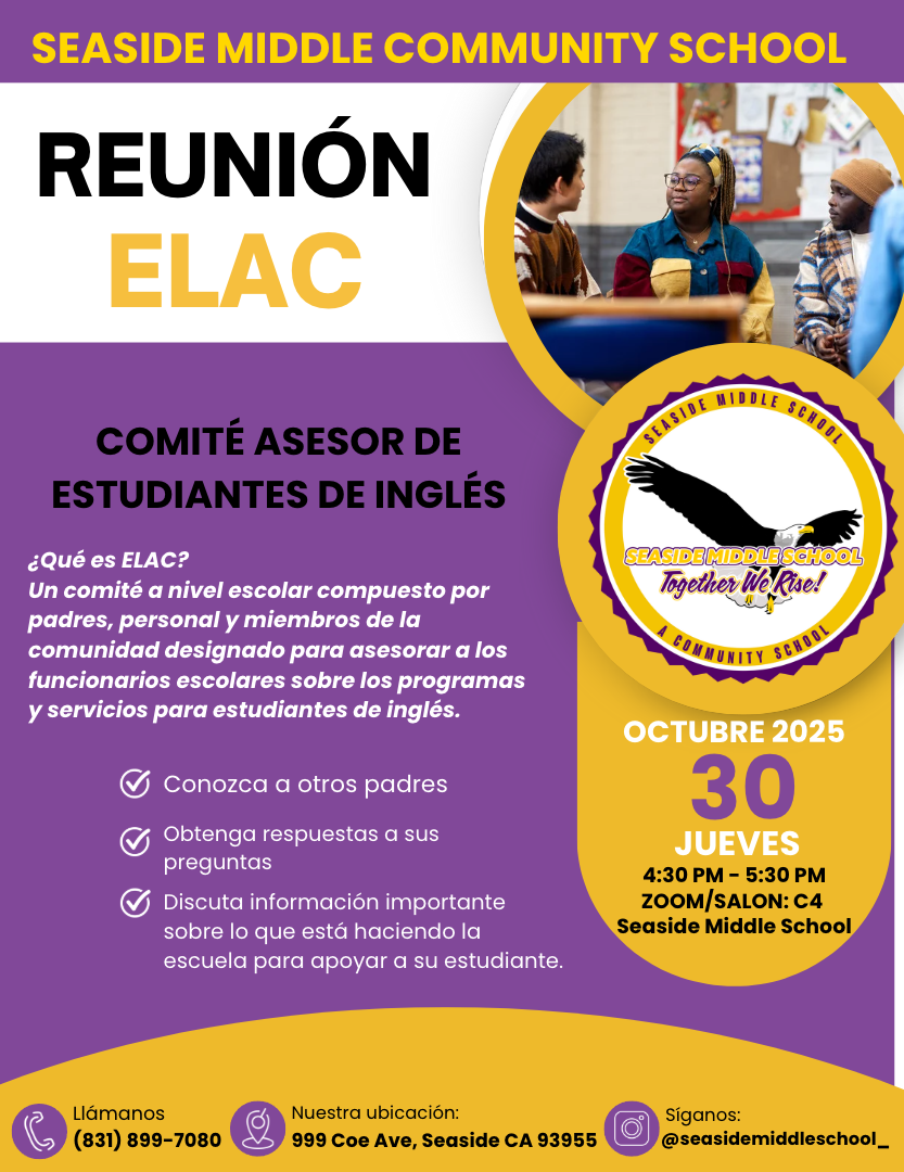 ELAC Meeting Tonight ELAC ZOOM Link WHEN: Thursday, October 30th, 2025WHERE:Seaside Middle School LibraryTIME:4:30 PM - 5:30 PM