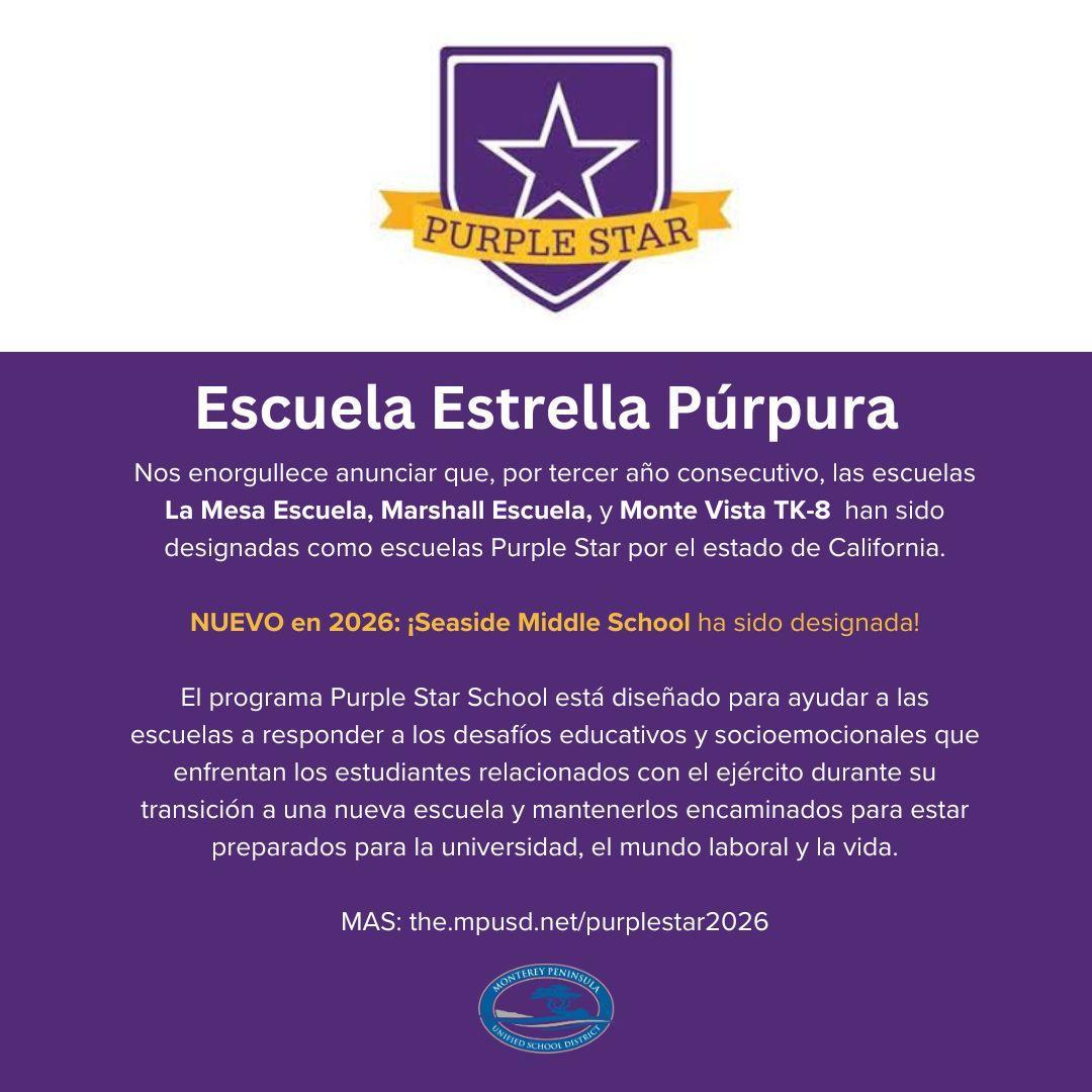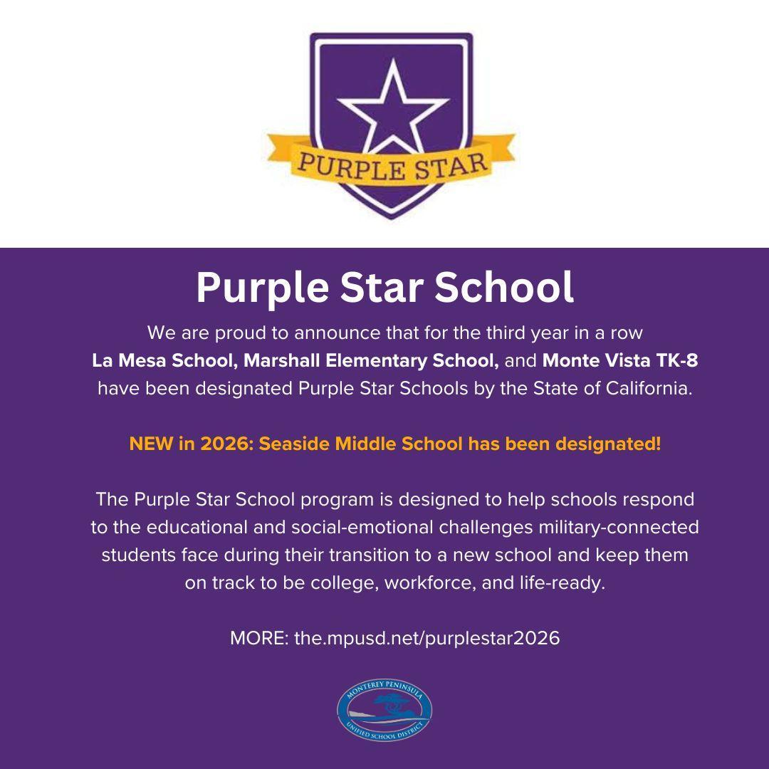 The Monterey Peninsula Unified School District is proud to announce that Seaside Middle School in Seaside, California, has been named a 2026 California Purple Star School by the California Department of Education.